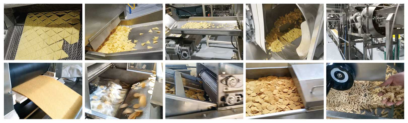 該生產線以玉米粉、面粉、大米粉為主要原料,經雙螺桿主機擠出薄片,再輥壓或沖壓成三角形、圓形、六邊形、卡通型等多種造型,后經油炸(或烘焙)、調味,即可生產出多種形狀及口味的、諸如“多力多滋”的薄脆片/餅食品,脆香可口、久吃不膩。