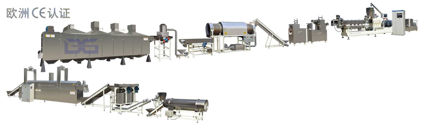 【1】拌粉機(jī)【2】螺旋提料機(jī)【3】DG75-II主機(jī)【4】3D壓花機(jī)【5】3D復(fù)合成型機(jī)【6】大提升機(jī)【7】3D分離機(jī)【8】3D篩選機(jī)【9】風(fēng)送機(jī)【10】冷卻攤料機(jī)【11】五層穿透式烘箱【12】4米連續(xù)油炸機(jī)【13】雙甩油線【14】調(diào)味線