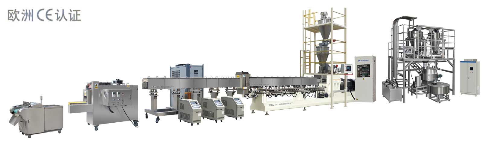 【1】拌粉機【2】螺旋提料機【3】DG75-II主機【4】步進切斷機【5】風送機【6】五層穿透式烘箱【7】5米冷卻輸送機